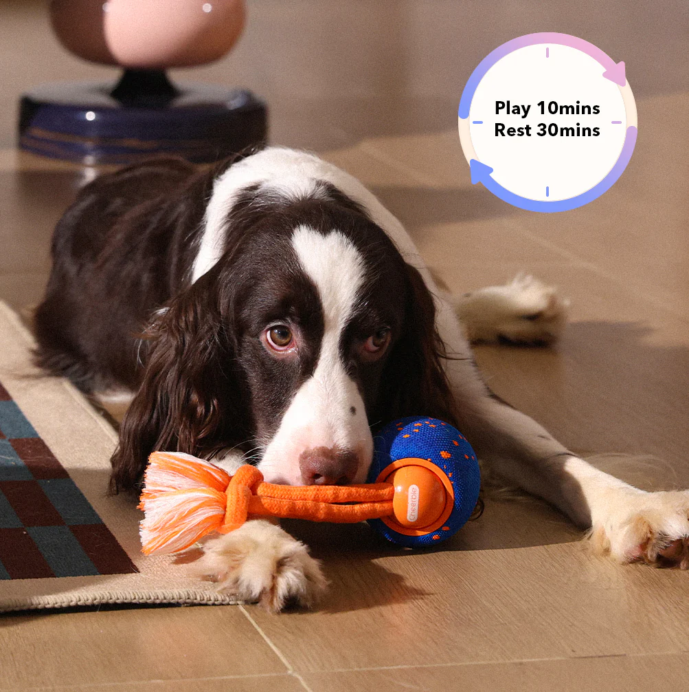 After 10 minutes of fun, it automatically goes into a 30-minute rest cycle so that your pup can have a good nap. Happiness can be returned anytime by tapping the Rolly.